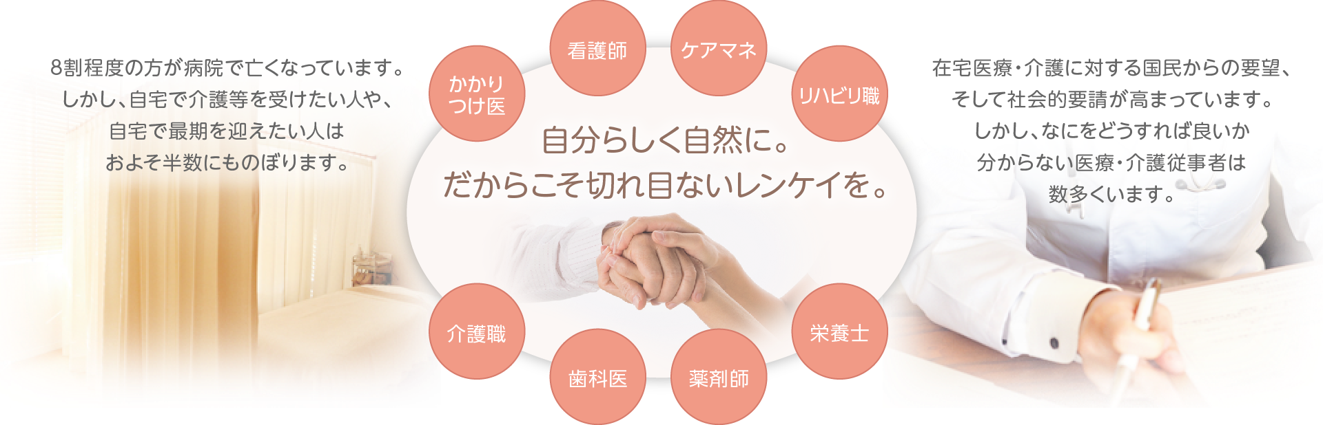 医療・介護間の多職種連携の推進により、切れ目のない在宅医療・介護サービスの提供を実現し、安心できる在宅医療生活が送れるよう支援します。